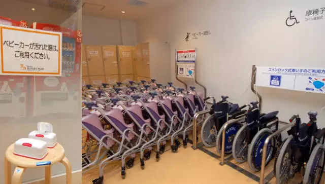↑为带孩子和身体状况不佳的顾客准备的婴儿车和轮椅设置于大门的入口附近,下车即可利用,最大限地减轻特殊顾客的体力负担。旁边放着消毒纸巾,用于擦拭婴儿车。