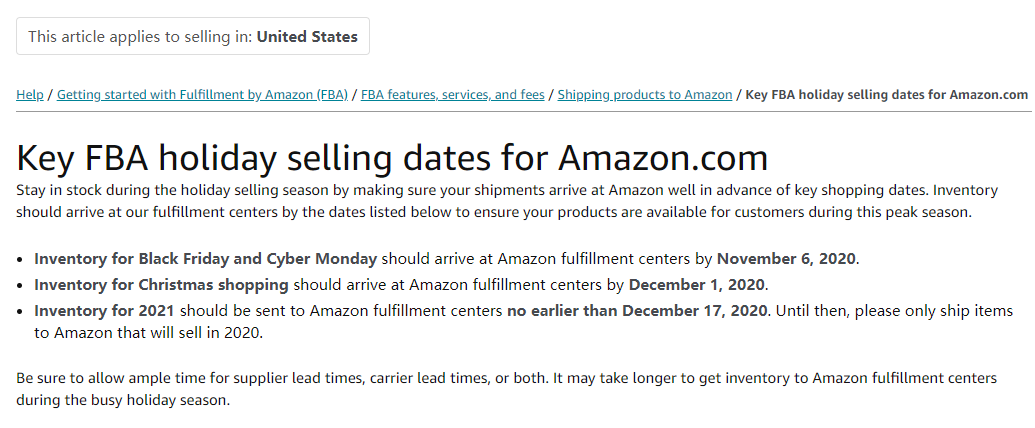 ◆ 2021年的库存应不早于2020年12月17日送到亚马逊的履行中心。在此之前,请只向亚马逊发货将于2020年销售的商品。