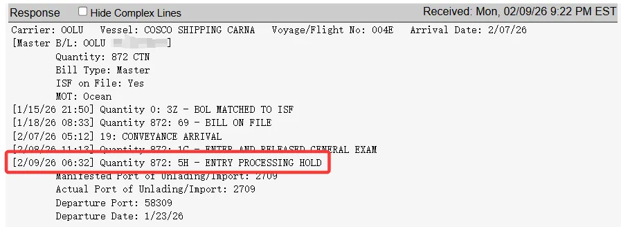 5H 全称:Entry Processing HOLD,是美国海关 AMS/ACE 系统下达的最高级别扣留指令。