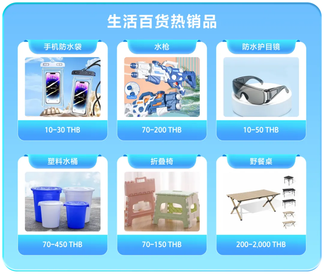 水枪和塑料水桶作为玩水的核心装备,是泼水节的必购产品。并且相比于水枪,当地人认为购买水桶更能提高“战斗力”;与此同时,手机防水袋,防水护目镜等防护装备,在泼水节期间也是不可或缺的必备产品;折叠椅便于携带,能为长时间户外活动提供舒适休憩;野餐桌则是节日好友聚餐与社交的必需品。