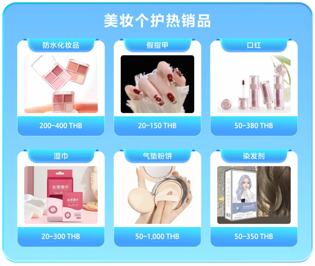 泰国泼水节期间,为了在尽情玩水的同时保持妆容完整、形象精致,消费者对具有防水、便携和节日氛围感的美妆个护产品需求显著上升。防水口红、防水气垫粉饼和防水化妆品因能抵御水花、保持妆容持久而持续热销;假指甲和染发剂则能帮助消费者提升造型精致度与个性表达,增添节日氛围;湿巾则因便于随时清洁而成为实用必备品。