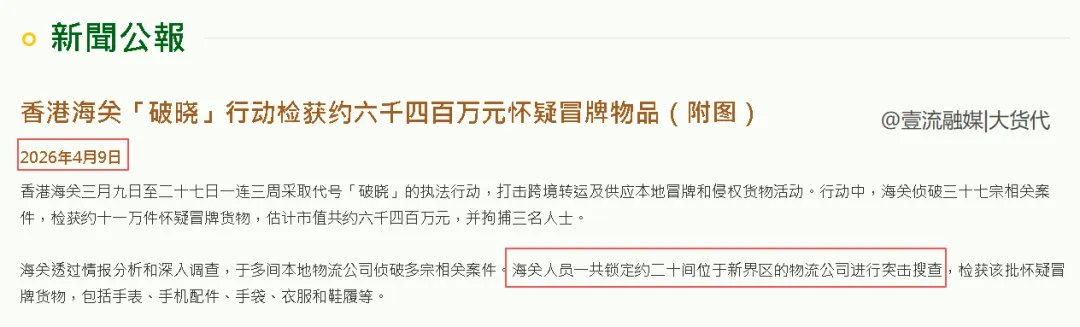 首先是香港海关4月9日发出的通报,称在3月9号-27号期间执行的“破晓”行动中,侦破37宗相关案件,检获约11万件仿牌货物,估计市值共约6400万元。
