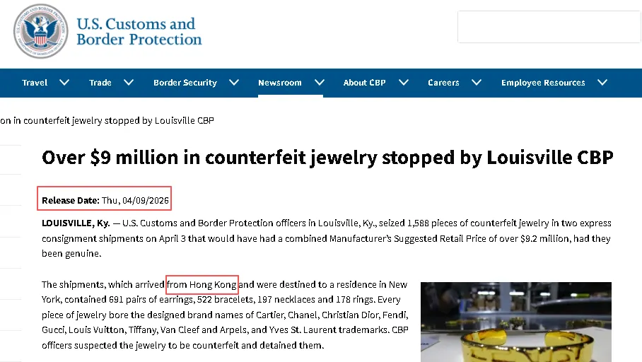CBP的通报显示,在当地时间4月3号,肯塔基州路易斯维尔的CBP官员在两批从中国香港运抵纽约的快递货物中查获了1588件仿牌珠宝,按正品零售价计算价值超过920万美元。