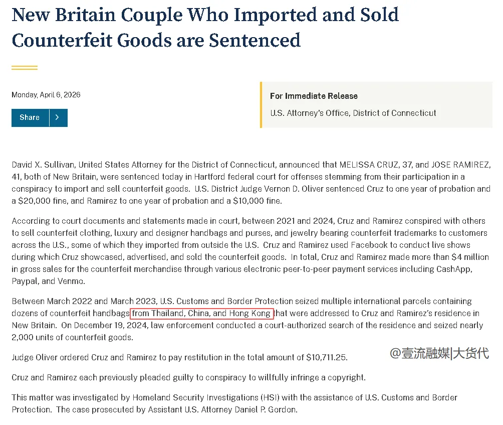 最后再讲一个来自美国司法部在4月6日披露的案件,同样是关于仿牌的。