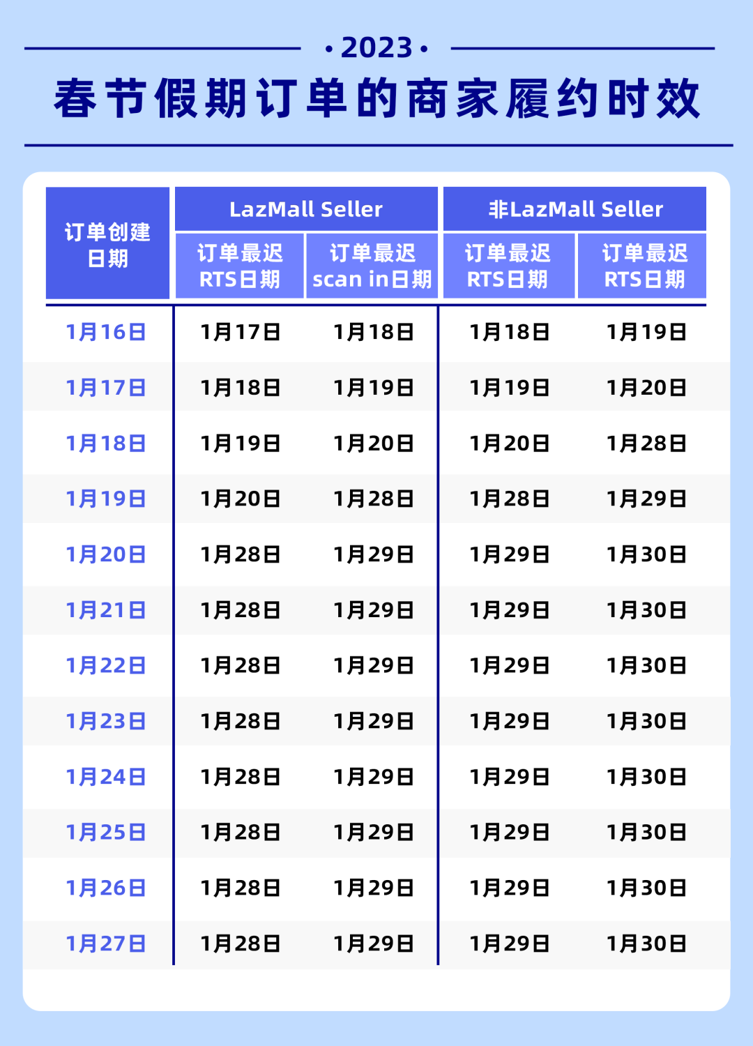 春节期间,Lazada跨境商家发货履约时效规则也将会有所调整,未入仓的商家需及时调整运营时间或及时开启假期模式,具体情况如下: