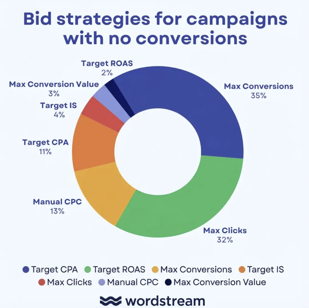 转化数据很少时,多数企业用最大点击量、最大转化量、手动 CPC 或目标展示份额策略。