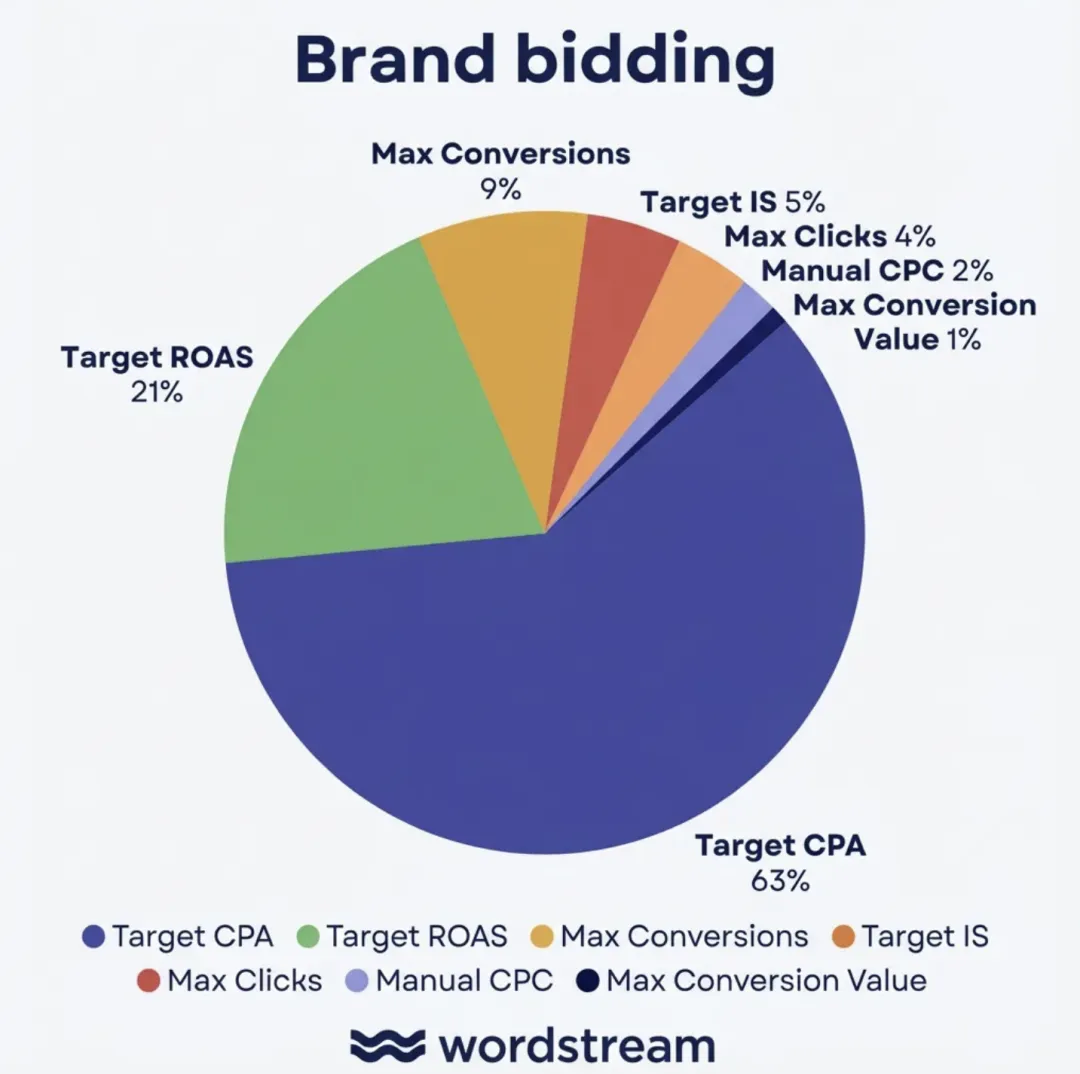 80% 的品牌广告系列用的是tCPA 或tROAS 出价。品牌词通常是最容易收集到转化的广告系列,所以转化数量足够多来激活智能出价的潜力——但也有可能是广告主应用了谷歌的出价建议,直接套用了tcpa。