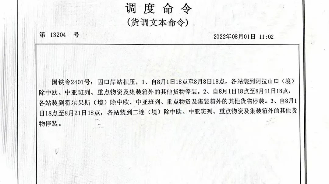 2、自8月1日18点至8月11日18点,各站装到霍尔果斯(境)除中欧、中亚班列、重点物资及集装箱外的其他货物停装。
