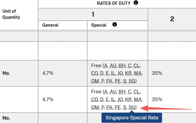 许多符合第 1 栏税率条件的国家,也可能符合第 1 栏“Special”子栏所列各项特殊贸易协定(Special trade agreements)的优惠关税税率(Preferential duty rates)条件,特殊税率(Special)栏反映了一项或多项特殊关税待遇计划(Special tariff treatment programs)下的关税税率,美国与若干国家签署了一些特定贸易协定(Trade Agreements)和关税优惠计划(Preference Programs),通常是多边或双边谈判的结果,或者是单边授权的结果,由美国国会颁布或由美国总统宣布,这些协定和计划在 HTS 的 GNs 部分中进行了描述(包括特定关税待遇的规则和条件等),符合条件的商品可以降低或免除关税,具体税率列在美国关税表第 1 栏的 “Special”子栏中。