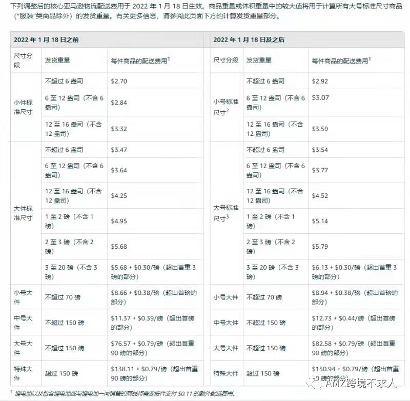 2. 对于所有的大号标准尺寸商品(服装除外),亚马逊将使用商品重量或体积重量中的较大值来确定其配送重量。 3. 亚马逊将根据不断变化的成本来提高移除和弃置费用。清货费用将保持不变,并将低于移除或弃置服务费用。