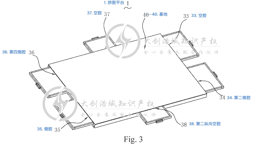 一块拼图板,用于拼放拼图;拼图板下方带有固定部。 在拼图板的底部,设有两个主要支撑壁(第一和第二主支撑壁),分别固定在板底的不同位置。 在拼图板的固定部上,还设有两个向上延伸的延伸壁(第一和第二延伸壁),每个延伸壁分别与对应位置的支撑壁上下叠合。