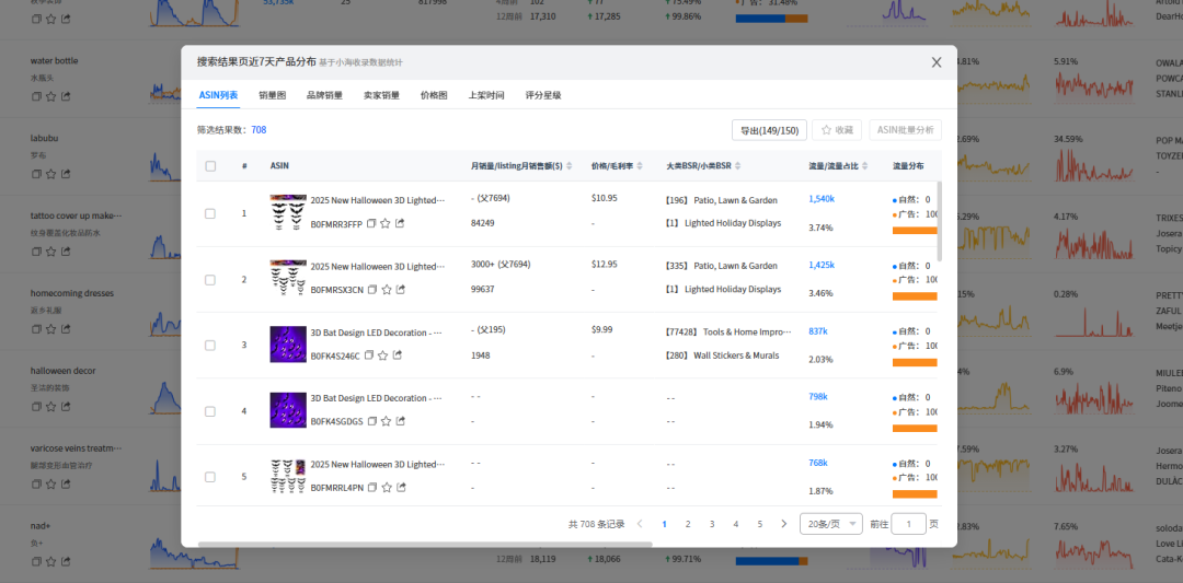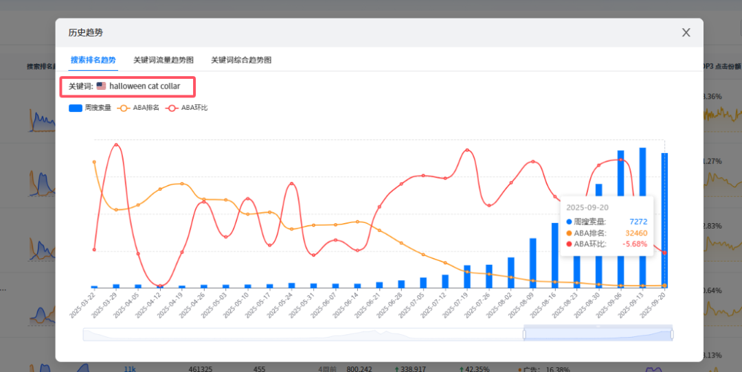 通过多个关键词的搜索结果页近7天产品分布数据来看,除了南瓜灯、蜘蛛网、骷髅头等经典元素,宠物万圣节装饰的热度呈现逐年攀升状态。特别是关键词“halloween cat collar”、“cat halloween costumes”的搜索排名趋势、关键流量趋势等在9月后都开始稳步上升。