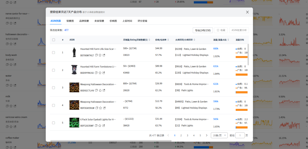 打开卖家穿海的【ABA数据选品】功能,选择查询最新一周的旺季风口词和近四周增长词,发现占比最高的词根是“halloween ”;相关衍生关键词如“halloween decor”、“halloween decorations outdoor”等搜索量均呈现快速上升趋势。