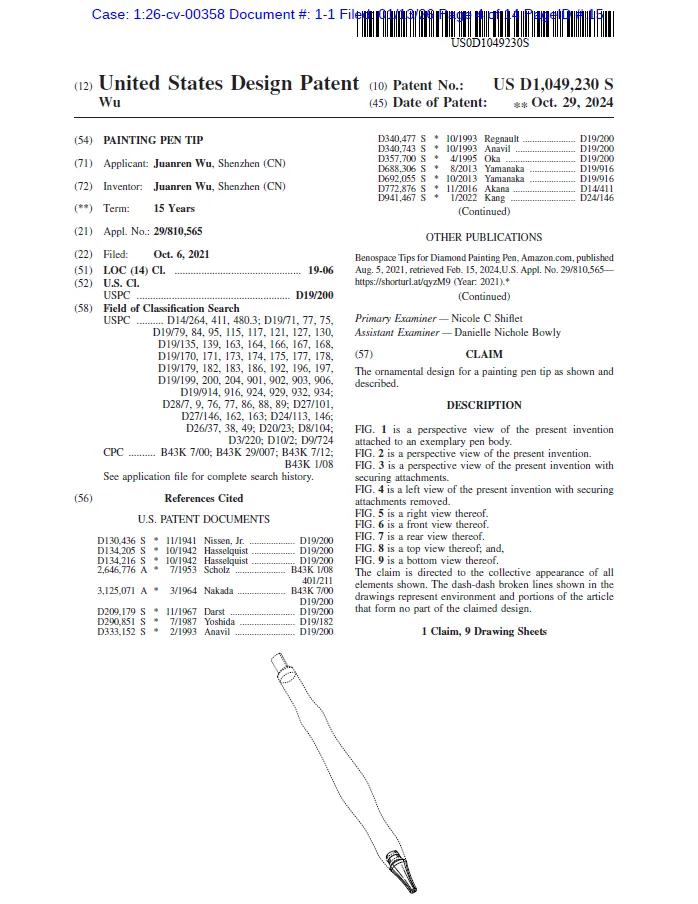 原告是 Juanren Wu一位国人卖家,此次维权的专利是 US D1,049,230 S,专利名称叫 “PAINTING PEN TIP(绘画笔尖)”,早在 2021 年就已经在美国提交了外观专利申请,并且在 2024 年 10 月成功拿到授权,该专利主要保护该钻石画笔尖的整体外观结构设计。
