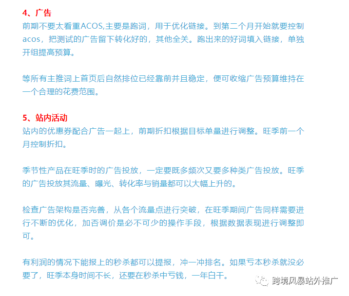 提前半年到一年开始准备,大致排期如下:提前半年开始找新品,做好市场调研,提前4-5个月开始备货,确定该季节性产品的销售月份。产品上架至少要在产品旺季前1-2个月上架完成,留足充分推广时间。热度上升期开始推广,整体的效果会好很多。中后期开始推广的产品,为下一期季节作铺垫。