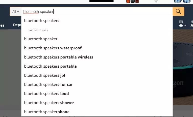 站内搜索是搜索栏的下拉官方关联词语推荐,以Bluetooth speaker为例,当我们输入关键词的时候,亚马逊会给我们自动匹配前面或者后面的词语,这些词语一般都是用户比较常用的搜索习惯,像Bluetooth speaker waterproof、Bluetooth speakers portable等后面的“防水、便携”等属性词就是用户搜索度比较高的,我们在自己写标题或者是设置关键词竞价时候也可以参考他们的排列组合顺序。
