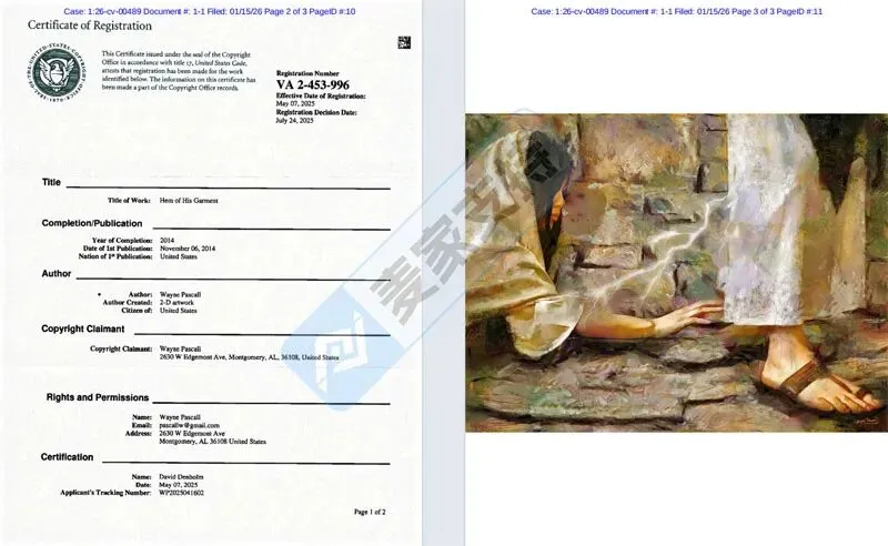 本案是keith律所代理美国艺术家Wayne Pascall发起的版权维权案件,涉案版权号为:VA 2-453-996,一张于2025年5月7日获得美国版权认证的祂衣袍下摆作品,本次案件共针对84个未经授权作为商业使用的店铺发起了维权,目前暂未获批TRO临时限制令,需要名单的卖家可联系我们获取,进行自查!
