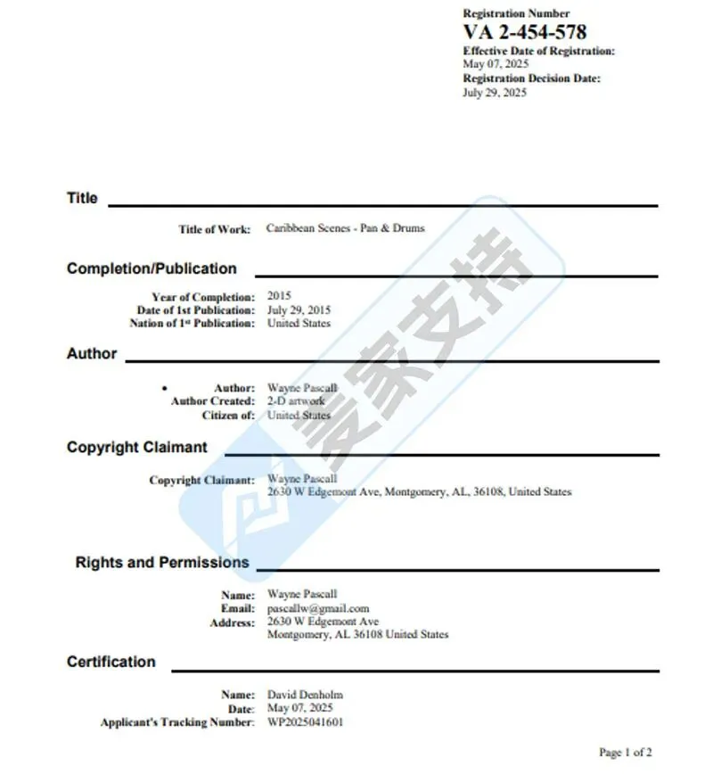 除此之外,Wayne Pascall在美国还注册有一张名为加勒比风情-钢鼓与鼓的版权作品,版权号为:VA 2-454-578,未经授权使用仍会有侵权风险,跨境卖家仍需注意排查规避!联系我们可进入keith律所案件专属群,实时掌握该律所最新案件动态,精准排雷。