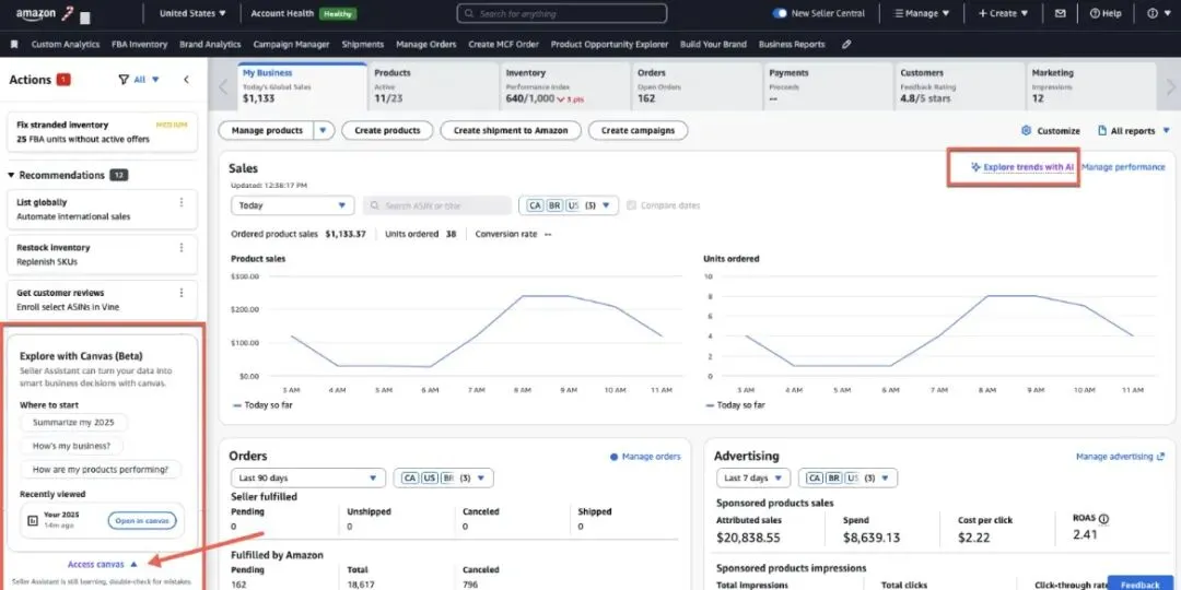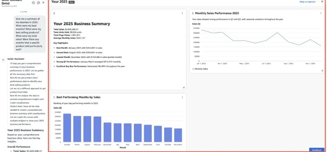 对卖家而言,Seller Assistant AI有了Canvas的结合,能快速帮你分析实际经营数据。