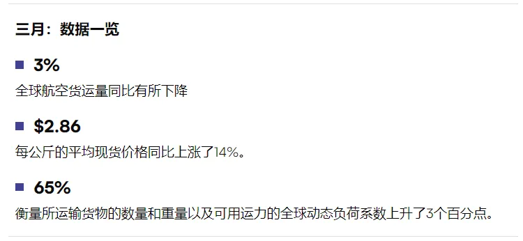 Xeneta的报告数据显示,2026年3月,全球航空货运的现货运价达到每公斤2.86美元,不仅超过了2025年的旺季水平,也创下自2024年12月以来的最高点。与此同时,3月份以现货运价运输的全球航空货运量占比上升了3个百分点至52%,仅比新冠疫情初期水平低1个百分点。