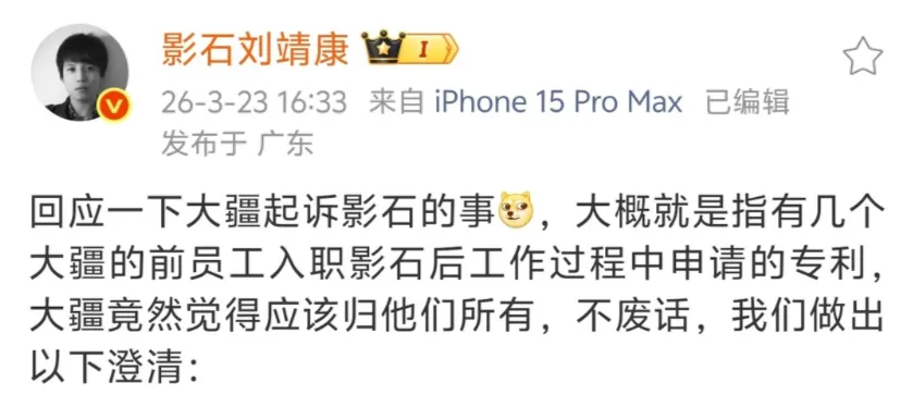 面对大疆的起诉,影石的反应相当迅速,不仅官方公告称“研发过程合法规范”,创始人刘靖康更是亲自下场回应。