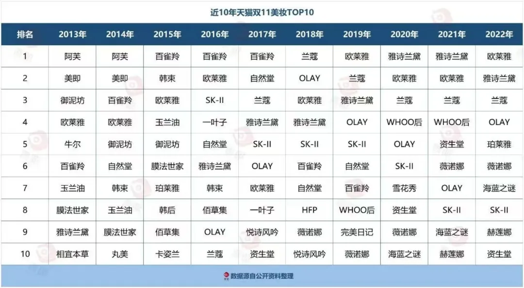 比如我们看这张图,2013年到2022年,TM平台前十名美妆品牌的变化,在2013年的时候,前十名的品牌,只有欧莱雅和雅诗兰黛两个国际品牌进入前十,那一年,国产品牌可谓是意气风发,包揽前三,到了2022年的时候,前十名的国产品牌只有珀莱雅和薇诺娜两家。