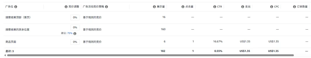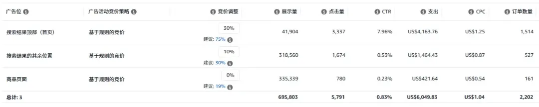 该案例中,广告活动全面采用基于规则的竞价策略,针对不同广告位设置了差异化的竞价调整比例,具体数据如下表所示: