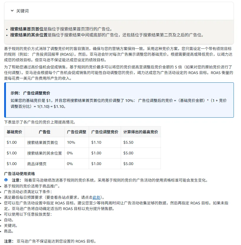 在分析数据差异原因之前,需先明确基于规则竞价的核心定义与运营要求,这是后续策略优化的基础。根据亚马逊官方定义,基于规则的竞价通过预设规则提升销量,同时力求将广告投资回报率(ROAS)维持在卖家设定的目标值,或采用亚马逊推荐的ROAS目标;其核心运作逻辑是通过动态提升或降低基础竞价,适配不同广告展示场景的转化潜力,从而实现预设的营销目标。