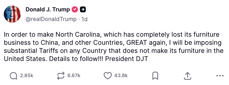 再加50%!美国对橱柜、家具开征高额关税