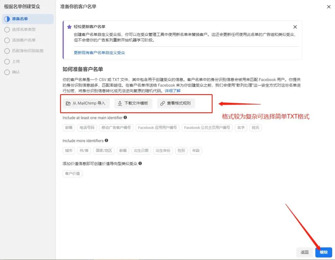 客户名单自定义受众:提前准备好客户名单,客户名单需要是准确的客户邮箱或者客户手机号码,之后上传至Facebook,后台会将这些信息与相应客户的 Facebook 个人主页进行匹配,从而对这些受众人群或者类似受众人群进行广告投放。