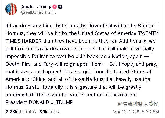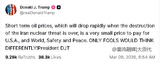 据悉,在本周日(当地时间3月9号),特朗普还在其社交媒体上说道:“短期油价上涨(一旦伊朗核威胁消除,油价将迅速下跌),对于美国乃至世界的安全与和平而言,这只是微不足道的代价。只有傻瓜才会持不同看法!”