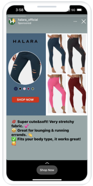 两个单元都投放了照片广告,展示公司以植物或露营为主题的有趣手机壳,以及诸如以下信息:“我们对我们的手机壳充满热情,这就是为什么我们直接在汉密尔顿的办公室制作它们。因此,如果您正在寻找能让某人脸上露出笑容的礼物,请浏览我们的最新设计并放心订购!”所有广告都包含一个“立即购买”按钮,该点击链接到公司的网站以供购买。测试发生在今年 4月20-5月3日 期间,使用 Advantage 的广告系列预算的网站购买量增加了 27%!Halara 是主要做高品质运动休闲服的独立站,主打健身和健康的生活方式!该公司在推出了一个新的 APP 之后,希望能有效地接触其目标受众,以提高知名度和安装量。为了推广新的 APP,该品牌想要测试运行 Advantage+应用程序广告系列的有效性,并查看它与 APP 安装广告的比较。为了确定结果的差异,该品牌进行了一项拆分测试,将一个具有多种创意变体的 APP 安装广告活动与 Advantage+应用广告活动进行比较。Advantage+应用程序允许 Halara 上传多达 50 张不同的图片、5 个不同的标题和 5 个不同的号召性用语。然后该活动通过组合所有可能的组合来动态化创意,以发现哪个组合反馈最佳结果,然后向相关受众提供效果最好的创意广告。由此产生的图片广告展示了 Halara 的运动服产品,以及号召性用户按钮,供观众通过 App Store 或 Google Play 安装该品牌的 APP。