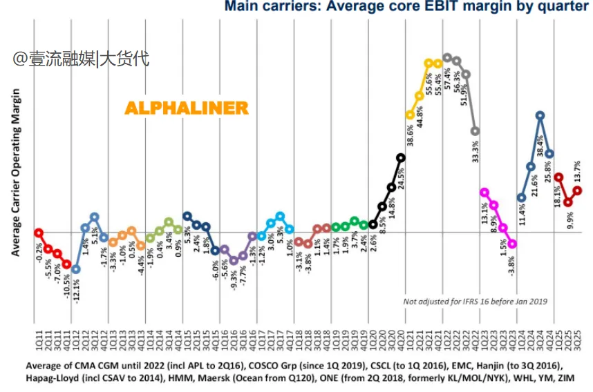 根据该报告的数据显示,在2025年第三季度,全球主要船司的平均营业利润率从第二季度的9.9%回升至13.7%,合计息税前利润超过43亿美元。