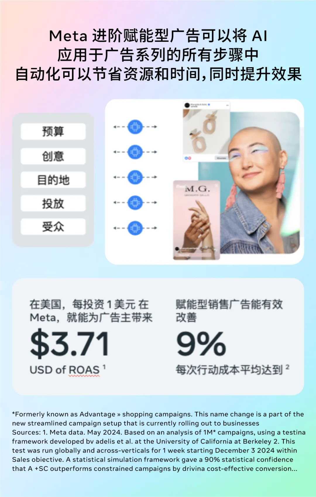 Meta进阶赋能型广告能将AI应用于广告系列的部分或所有步骤中,从预算分配到素材优化,实现比人工更精准、更高效的投放。