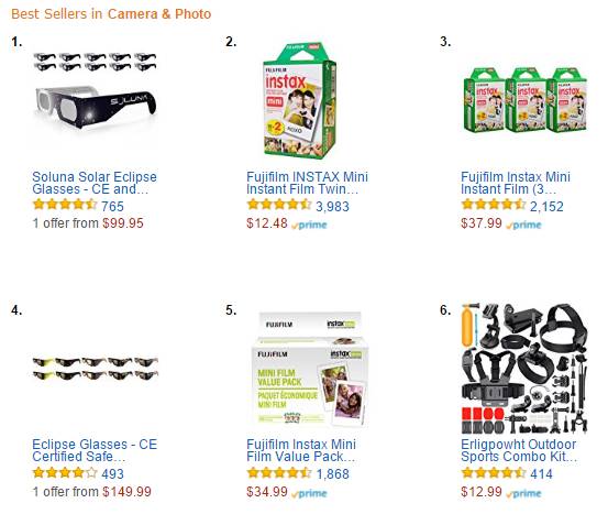 第一套最畅销的日食眼镜由Soluna制造,一套10副,通过了ISO和CE认证,分布在home improvement和camera and photo等多个类目下,由第三方卖家销售(非亚马逊自营)。