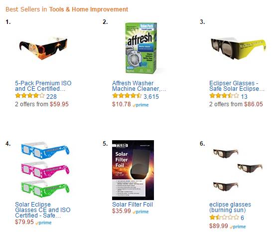 目前tools and home improvement类目下最畅销的是一套5副一盒装的,通过ISO、CE认证的日食眼镜。5月17日售价为8.50美元,7月25日达到最低价6.50美元。今天它的售价为59.95美元,达到历史最高。