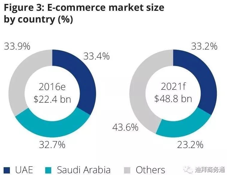 咨询公司德勤(Deloitte)的一份报告指出,2016年中东地区线上销售总收入224亿美元,同比增长24%;预计2016-2021年将保持16.9%的复合年均增长率。到2021年,中东地区电子商务市场总额预计将达488亿美元。其中,阿联酋和沙特成为领军者,二者联合比重超过地区市场总额一半以上。