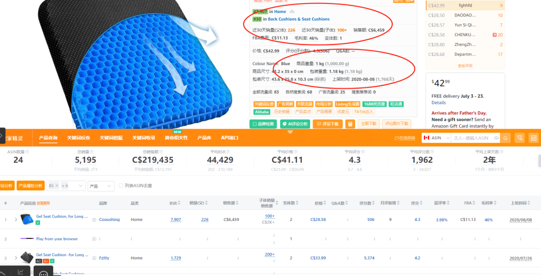单量:在卖家精灵中显示上架时间是2020年08年08号,目前为止持续销售1768天,30天销售量(226单),子体(100+)