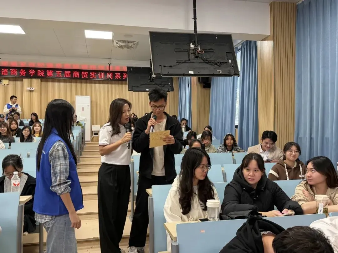 宣讲会特别设置了互动问答环节,瞬间点燃现场气氛。同学们围绕职场晋升路径、技能提升要求以及跨境行业前沿动态等核心问题踊跃提问。