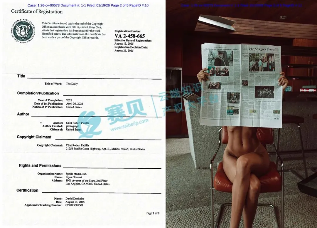 从赛贝TRO案件查询系统获悉,2026年1月19日,美国伊利诺伊州北区法院正式受理一起版权侵权TRO(临时限制令)案件,案件号为26-cv-573。该案由Keith律所代理美国摄影师Clint Robert Padilla发起,核心指向两张人像摄影作品的版权侵权行为,目前涉案19家店铺账户暂未冻结,但风险已全面升级,相关跨境卖家、内容从业者需立即开展自查。