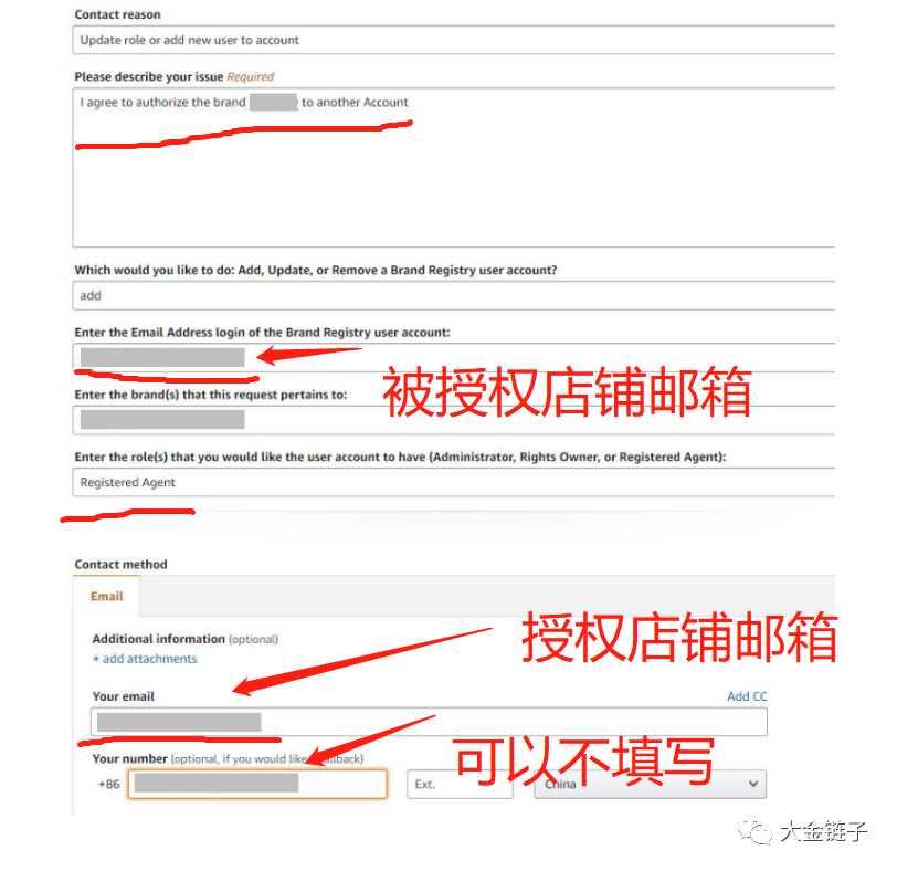 5. 然后选择正确的“Update role or add new user to account”路径,用英文填写被授权卖家的相关信息,联系到对应的品牌备案处理团队,他们会为您添加账户。