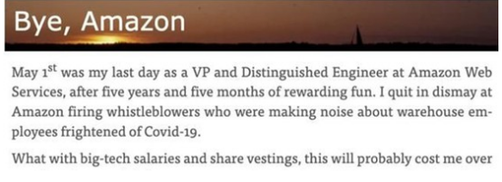 Tim Bray在文章中表示,亚马逊解雇组织抗议活动员工的行为背离人道主义,用镇压的方式平息不同的声音,是“懦夫”行为。