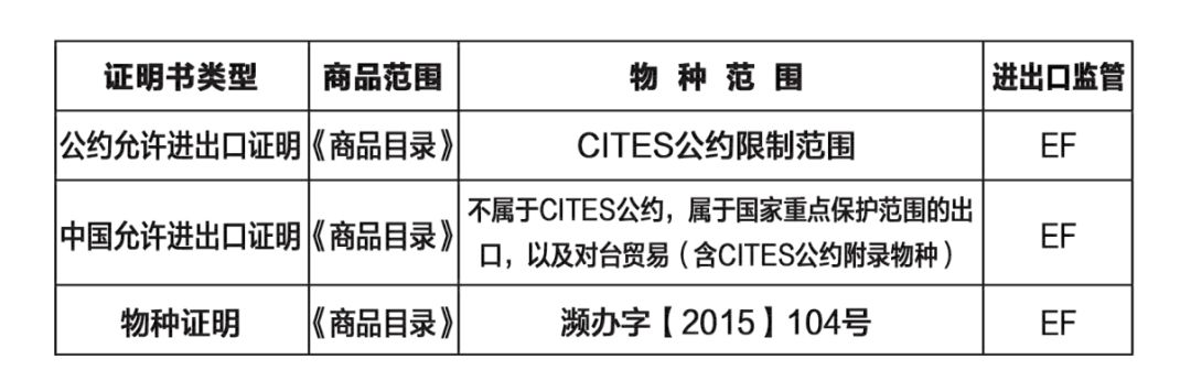 2.中华人民共和国野生动植物允许进出口证明书(中国允许进出口证明):货物归类属于《商品目录》,不属于CITES公约限制物种,但属于国家重点保护的野生动植物及其产品的允许出口以及对台贸易证明。