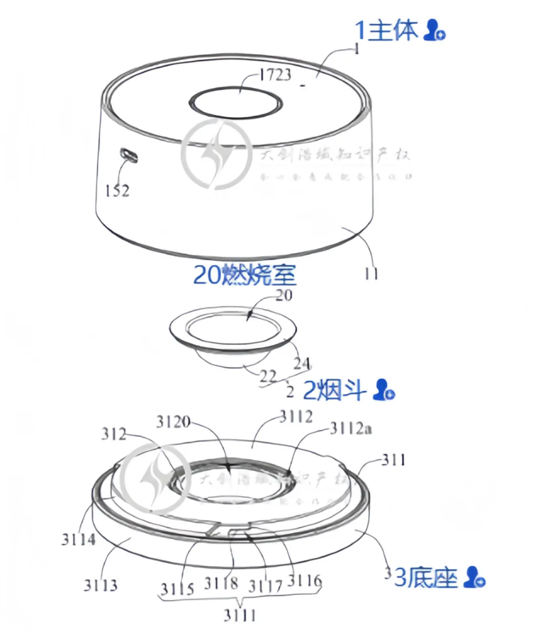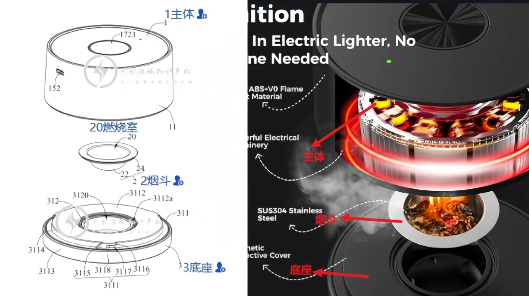 判断实物是否落入对方发明专利:一种自动烟熏器,包括:烟熏器的主体[1];具有燃烧室[20]的烟斗[2],其中,燃烧室[20]的内壁限定有至少一个烟气出口;以及底座[3],其中,烟斗[20]设置在主体[1]与底座[3]之间,主体[1]与底座可拆卸地组装,并且主体[1]与底座被配置为在组装过程中将烟斗[20]固定在其之间;