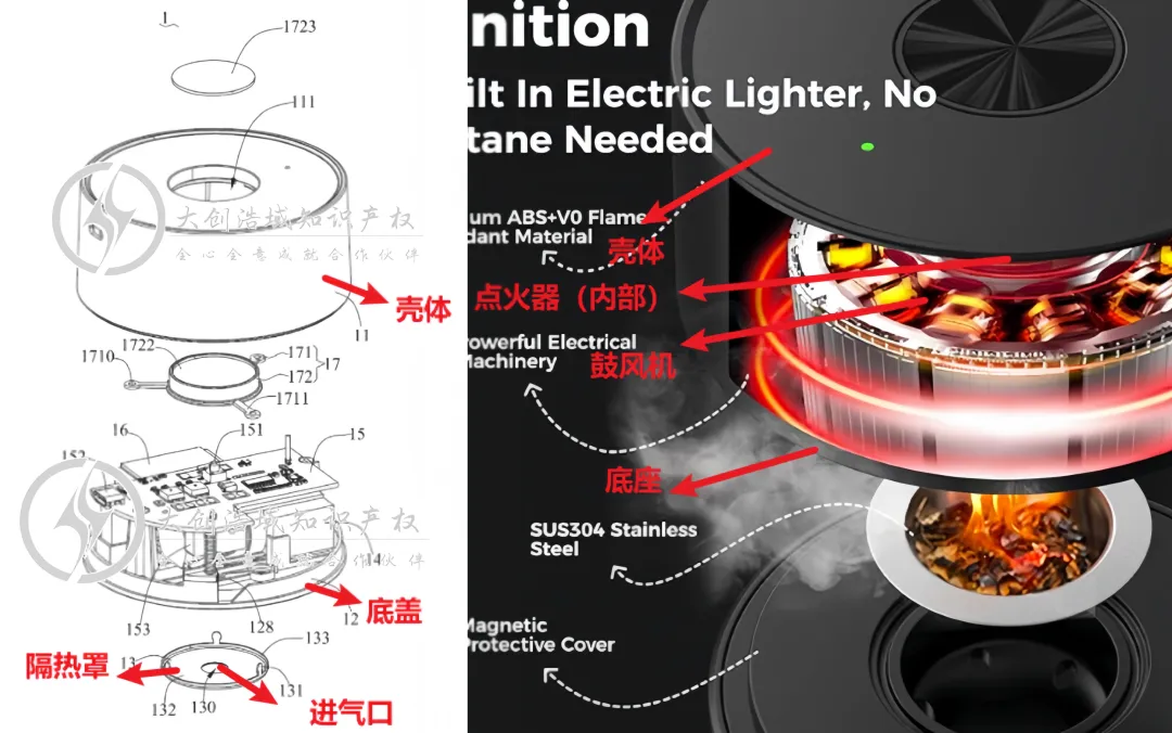 判断实物是否落入对方发明专利:吸主体[1]包括:壳体包括壳体11、底盖12和隔热罩13,隔热罩13设置在所述底盖远离所述壳体的一侧,并与所述底盖连接,所述隔热罩用于打开或者关闭所述燃烧室[20],所述隔热罩上开设有进气口;内部设有点火器。