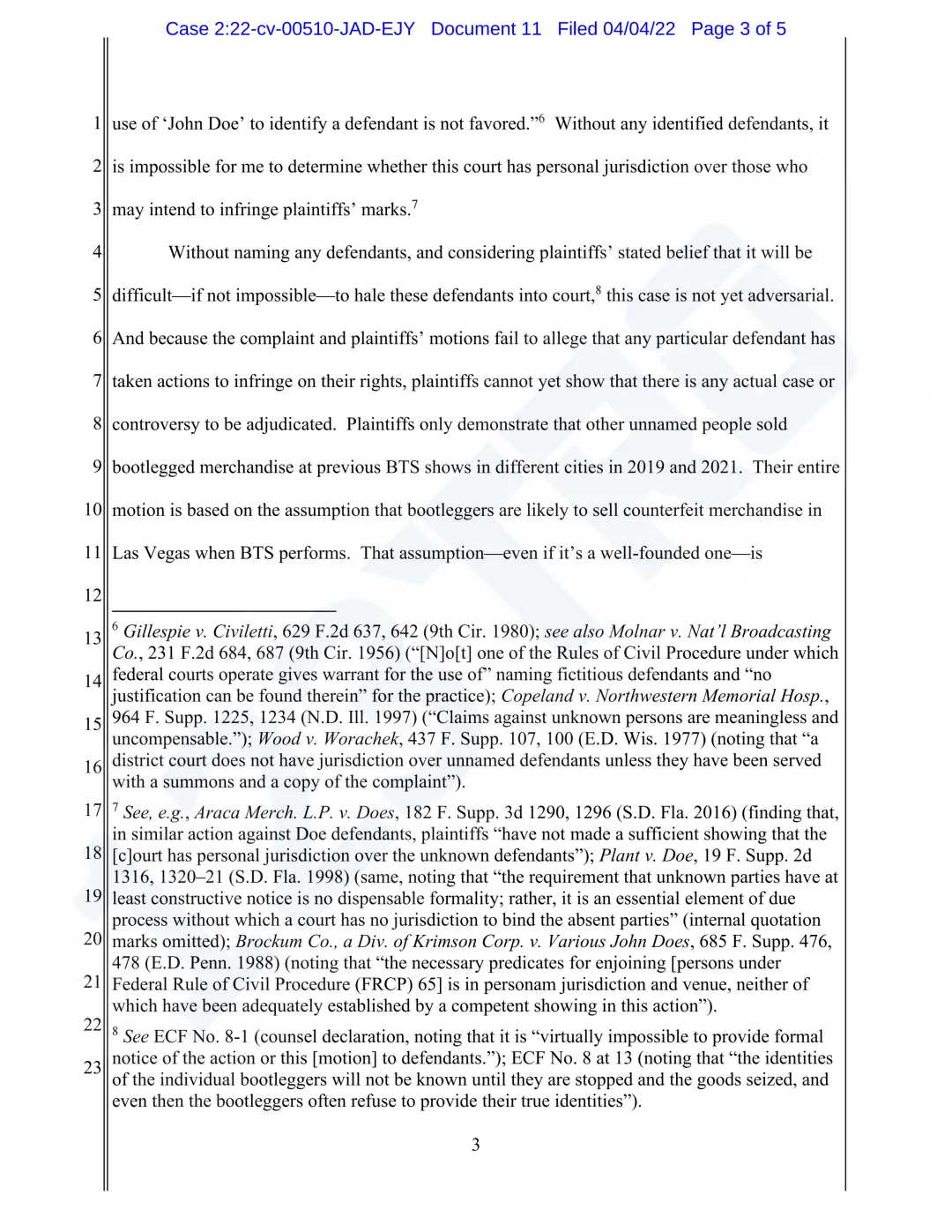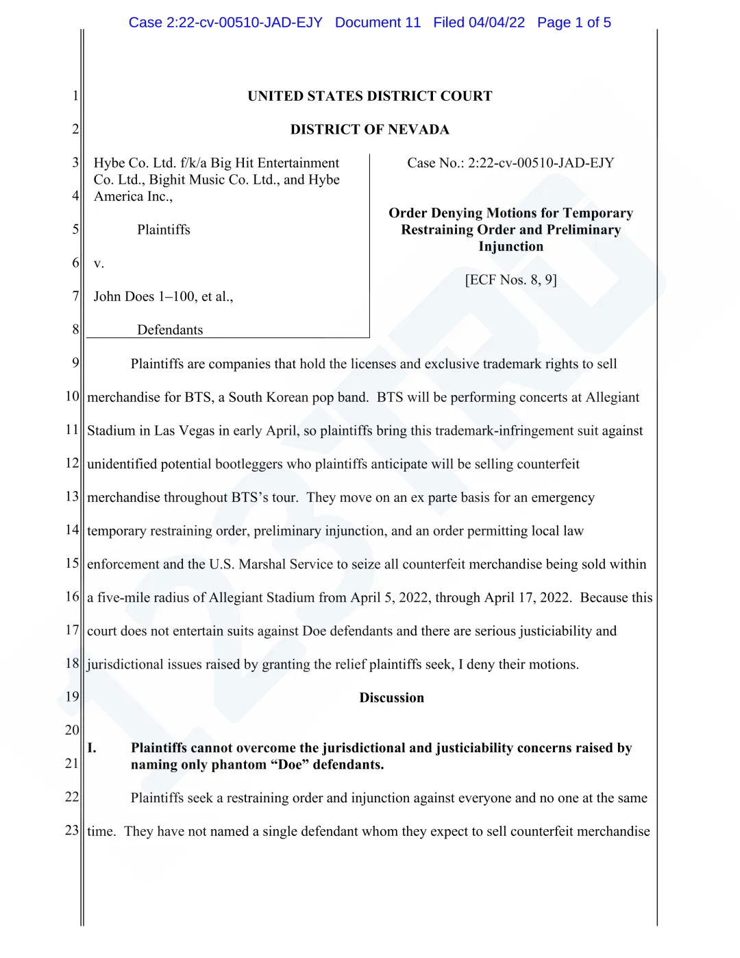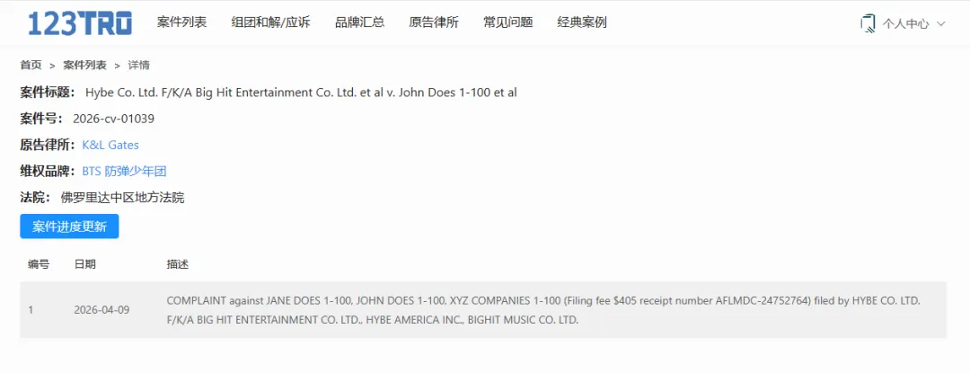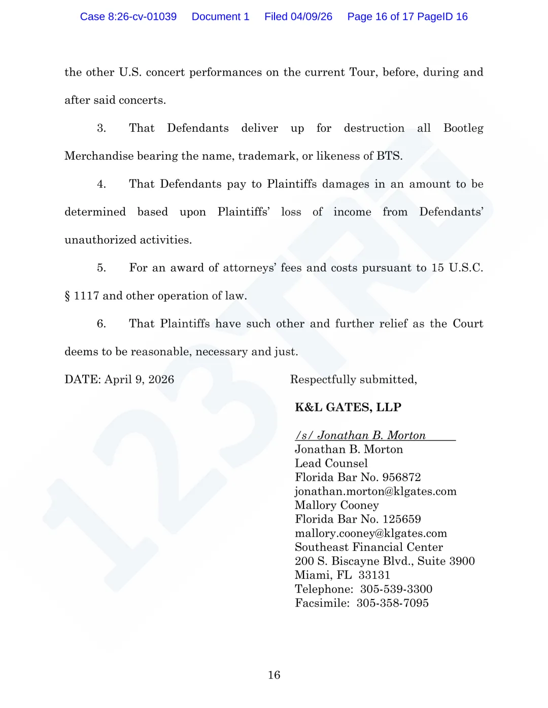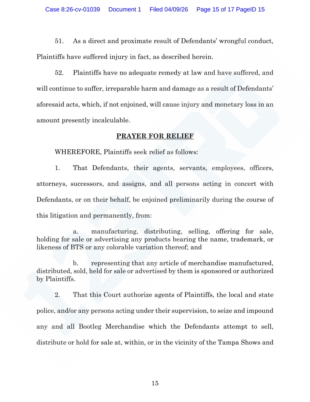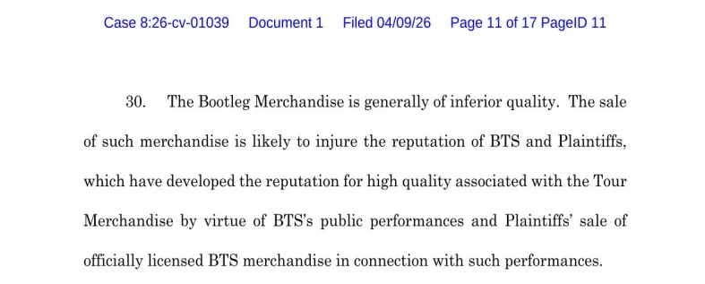 他们表示,被告在BTS 2026 ARIRANG世巡的美国场次(首站坦帕)场馆及周边,销售未经授权的假冒BTS周边