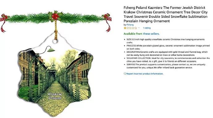 近日,有卖家在亚马逊电商平台上销售奥斯维辛集中营的圣诞节纪念品,被指责侮辱受害者,遭平台下架。