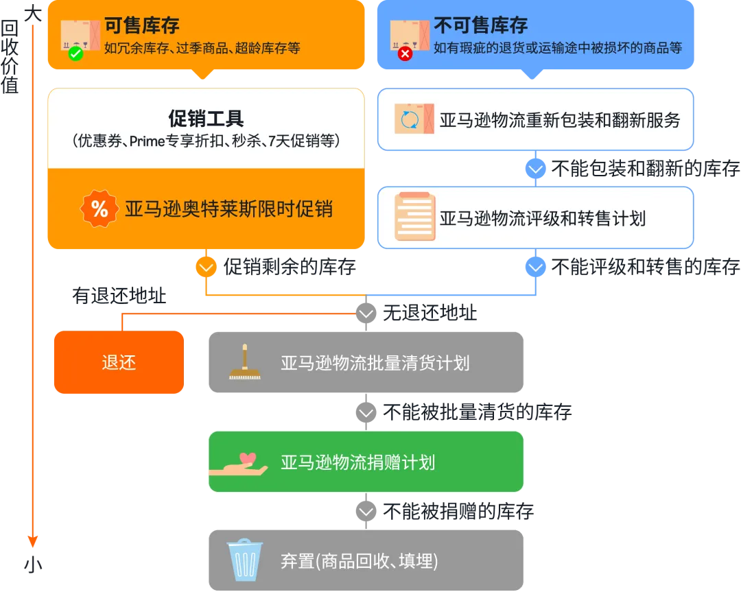 对于不能作为新品销售的积压库存和退货,亚马逊批量清货计划将这些库存销售给予亚马逊有合作的清算商,从而帮助卖家消化冗余库存和退货商品、避免缴纳弃置库存处理费,还能收回5%-20%的商品价值。
