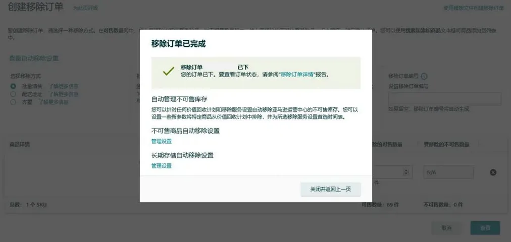 系统将提示您检查并确认移除订单详情。检查无误后,点击确认,即可完成创建移除订单。