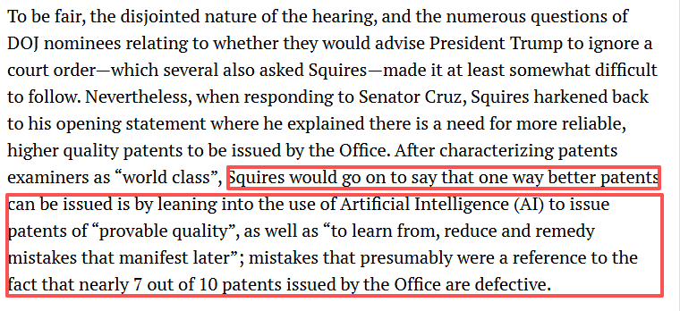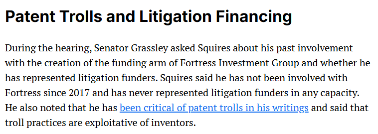图源听证会新闻 专利流氓:认为该行为只有骚扰价值,而不是专利的实际价值,支持上诉委员会遏制低质量专利滥用中的作用